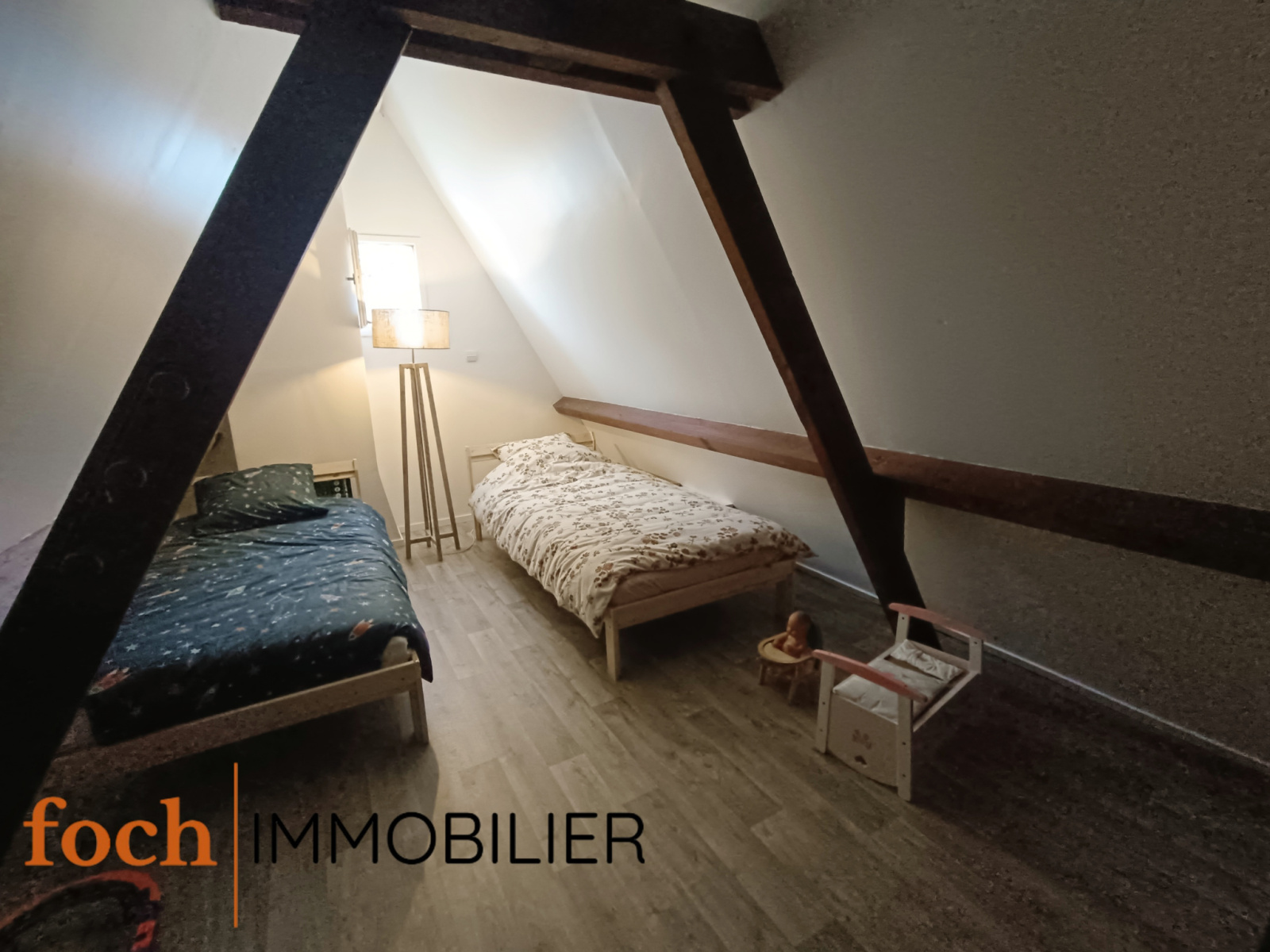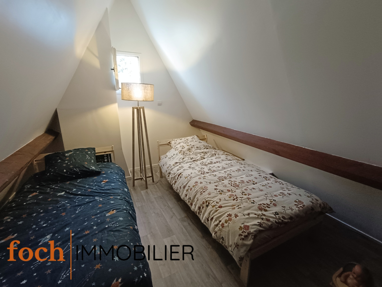 Au premier étage se situe un palier desservant une grande chambre lumineuse avec espace de rangement et une salle de bains.