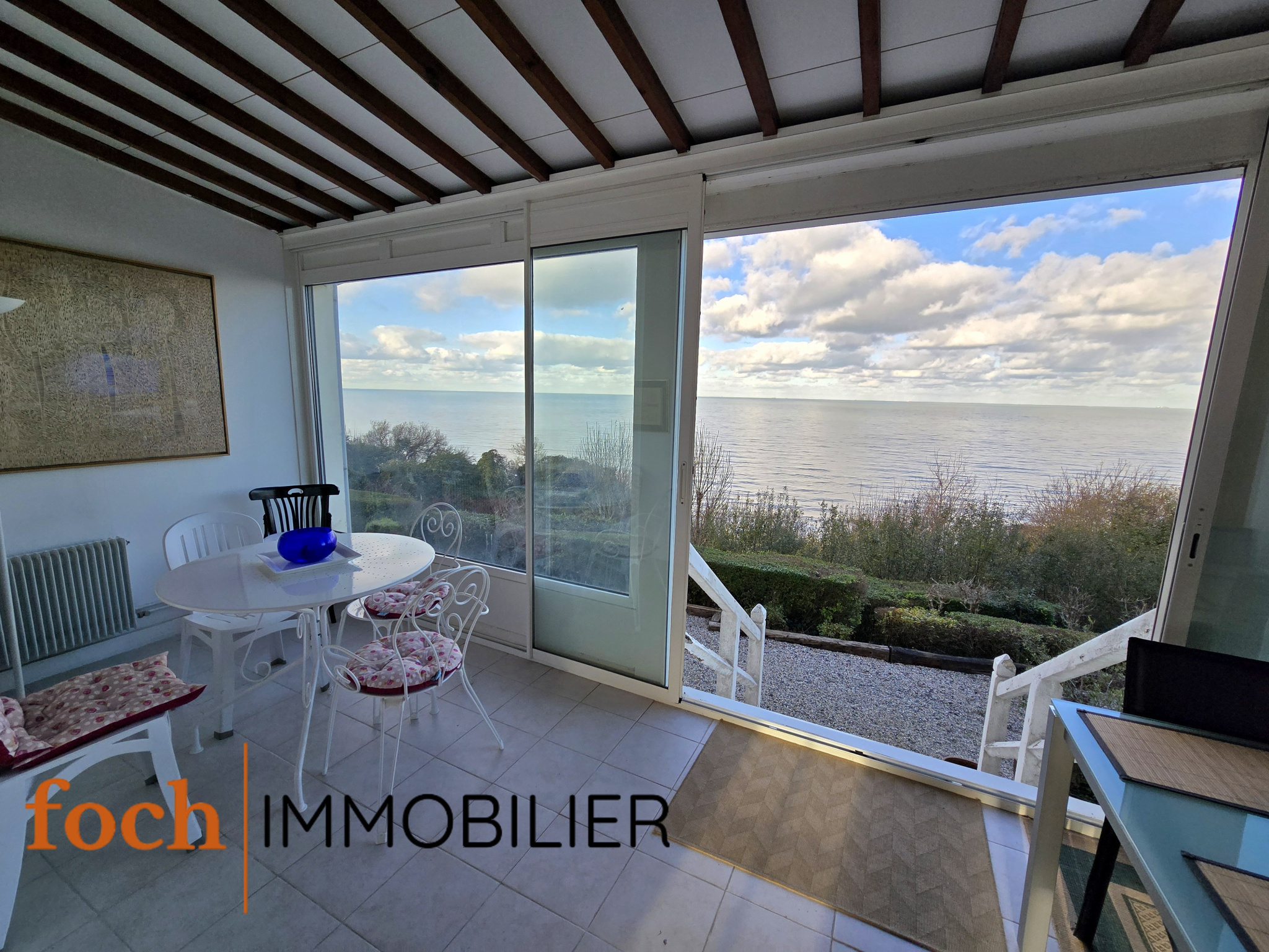 Situé au sein d'une Villa balnéaire avec son accès privé vers la mer l'appartement se distribue en une entrée, un grand séjour/salon avec cheminée, une grande véranda avec une vue à 180° sur la mer, deux chambres dont une avec bow window tourné vers la mer, une cuisine séparée, une suite parentale avec accès sur le jardin et vue sur la mer.